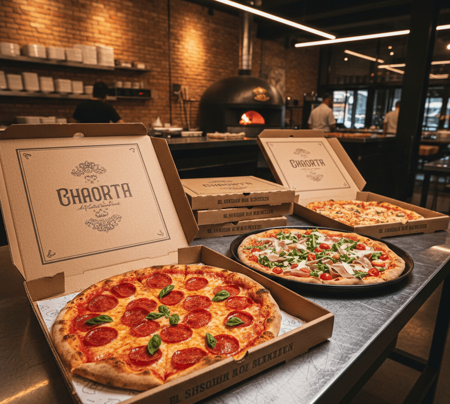 กล่องพิซซ่าส่วนใหญ่ทำจากกระดาษลูกฟูก (Corrugated Board) ซึ่งมีข้อดีคือทนความร้อน ระบายอากาศได้ดี และช่วยรักษาความกรอบของพิซซ่า